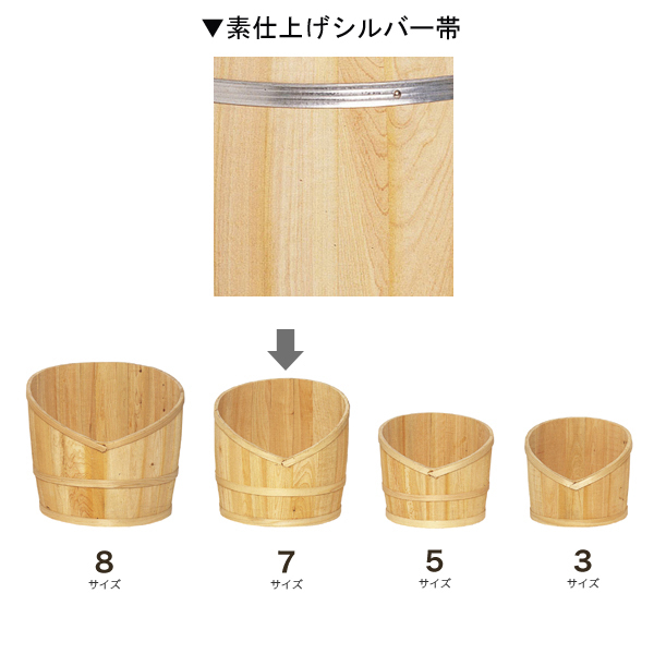 「売ったる!」の売樽を横割りして、正面をV字にカットしてあるので、中の商品にボリューム感が出ます。素仕上げでシルバー帯タイプです。シルバー帯が樽を引き締めます。