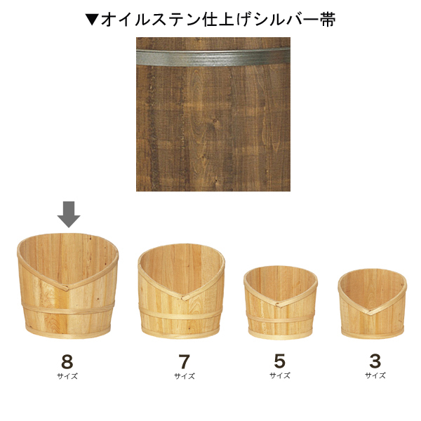 「売ったる!」の売樽を横割りして、正面をV字にカットしてあるので、中の商品にボリューム感が出ます。オイルステン仕上げでシルバー帯タイプです。オイルステンカラーで雰囲気のある樽に仕上がっています。