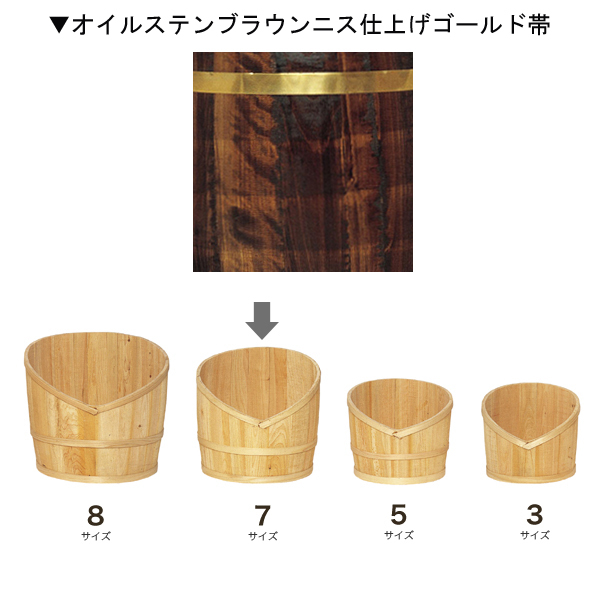 「売ったる!」の売樽を横割りして、正面をV字にカットしてあるので、中の商品にボリューム感が出ます。オイルステンブラウンニス仕上げでゴールド帯タイプです。一番ゴージャスで、ピカピカした仕上がりの樽です。