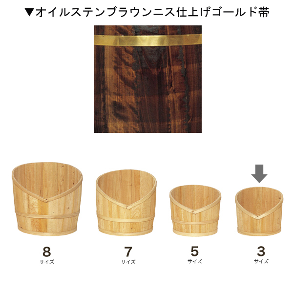 「売ったる!」の売樽を横割りして、正面をV字にカットしてあるので、中の商品にボリューム感が出ます。オイルステンブラウンニス仕上げでゴールド帯タイプです。一番ゴージャスで、ピカピカした仕上がりの樽です。