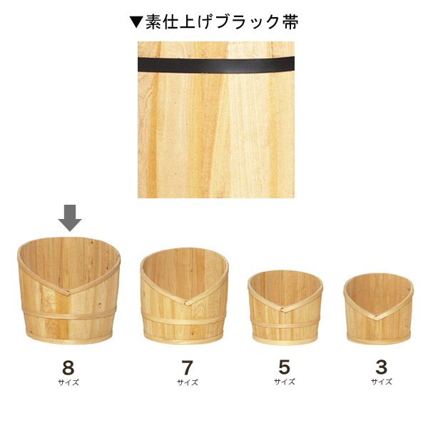 「売ったる!」の売樽を横割りして、正面をV字にカットしてあるので、中の商品にボリューム感が出ます。素仕上げで黒帯タイプです。一番スタンダードな仕様の樽です。